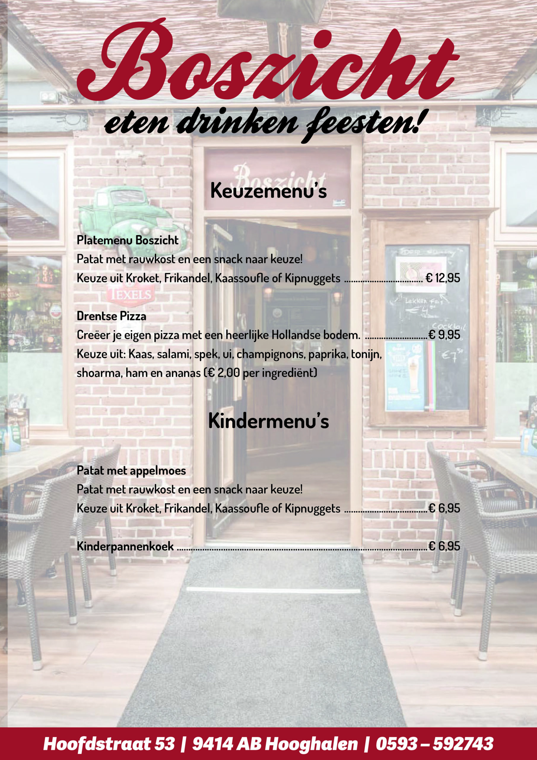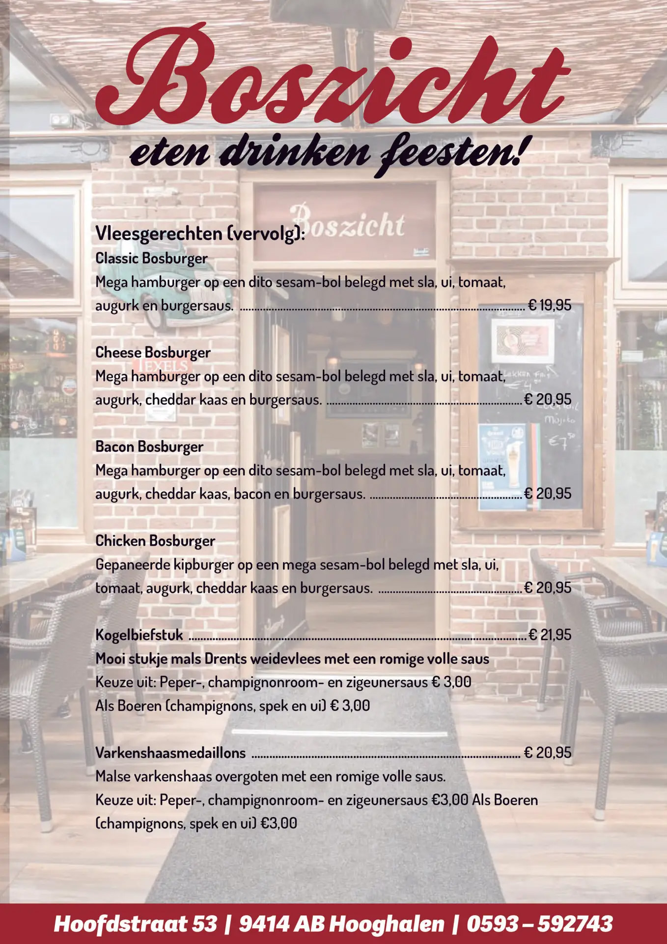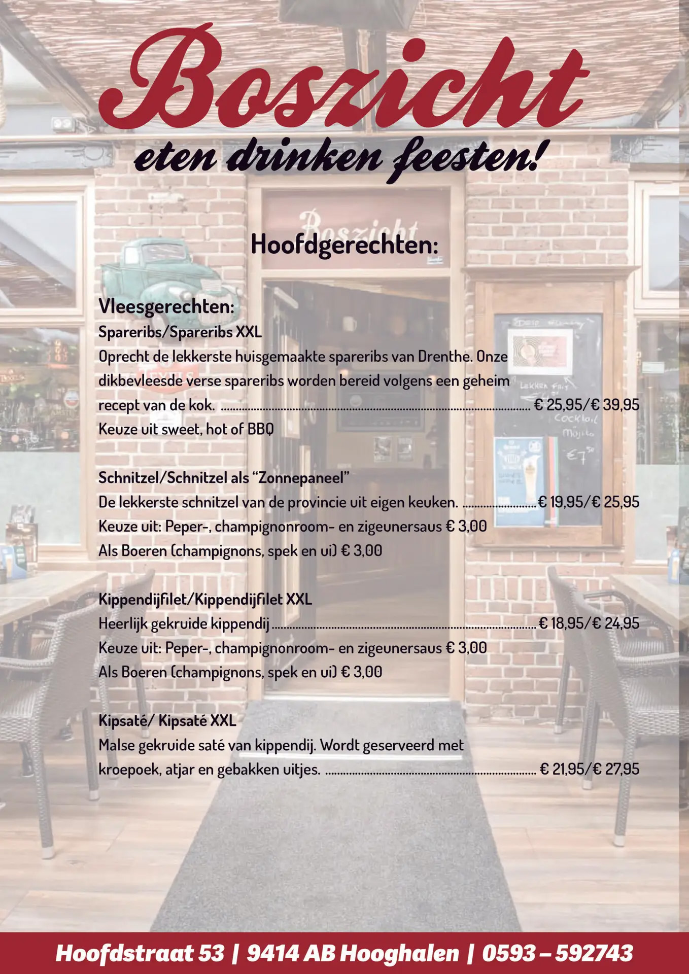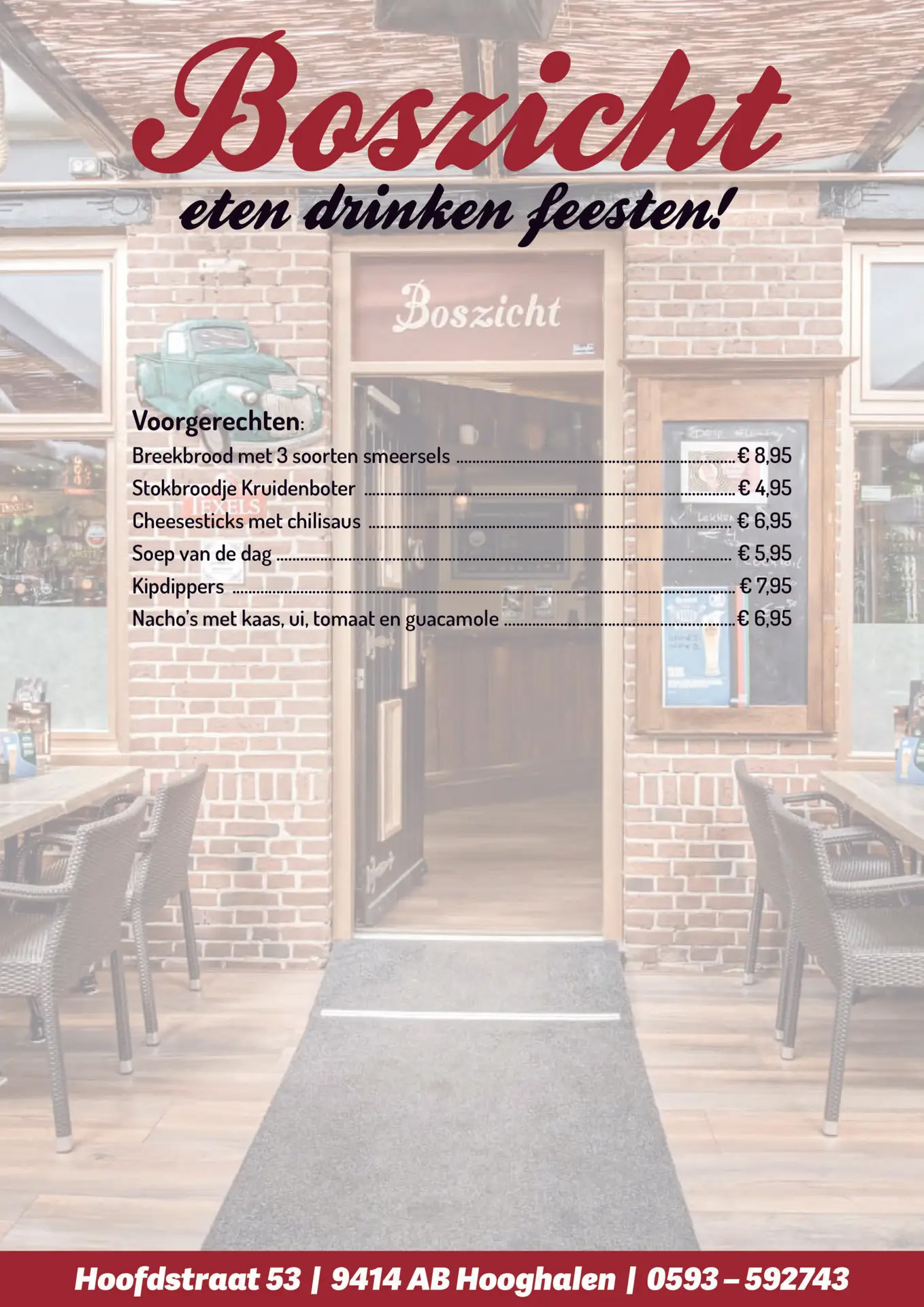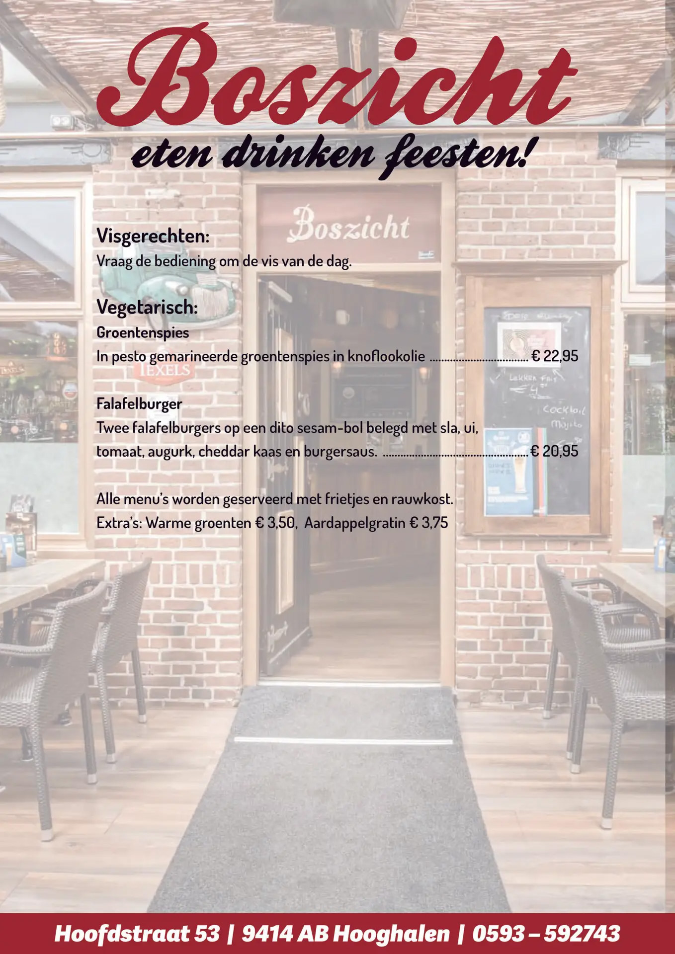 Bij Dinercafé Boszicht geniet je van (h)eerlijk eten in een warme, ongedwongen ambiance. Onze keukenbrigade bereidt elke maaltijd met zorg, passie en oog voor detail. Heb je speciale dieetwensen of allergieën? Geen probleem. Wij denken graag met je mee en passen onze gerechten aan waar mogelijk. Geef je voorkeuren gewoon even door bij je reservering, dan zorgen wij voor een smaakvolle beleving op maat.