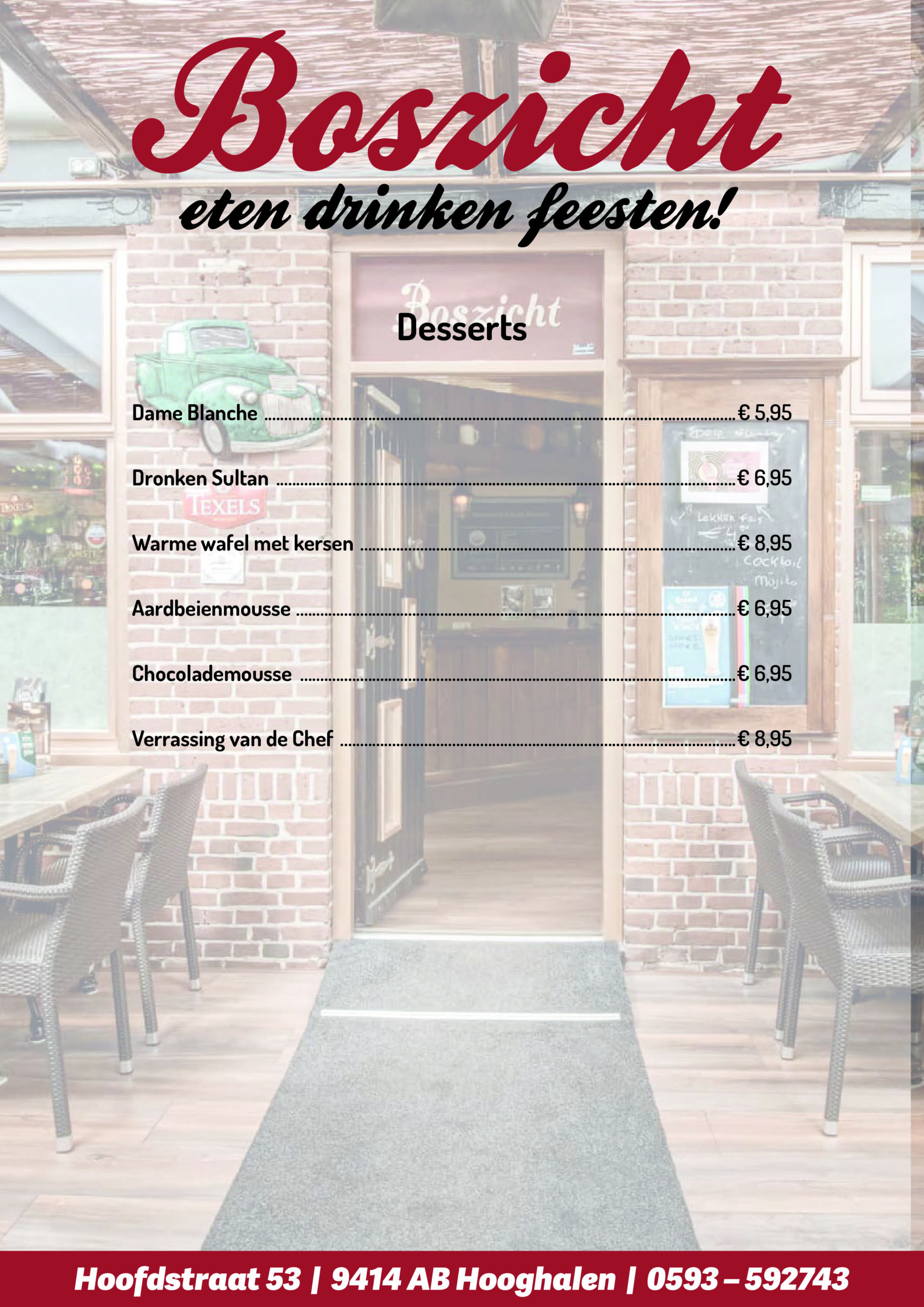 Bij Dinercafe Boszicht geniet je in ongedwongen sfeer van de meest overheerlijke gerechten. Wij houden zo veel mogelijk rekening met dieetwensen- en eventuele allergieën. Geef dit bij de reservering even door.